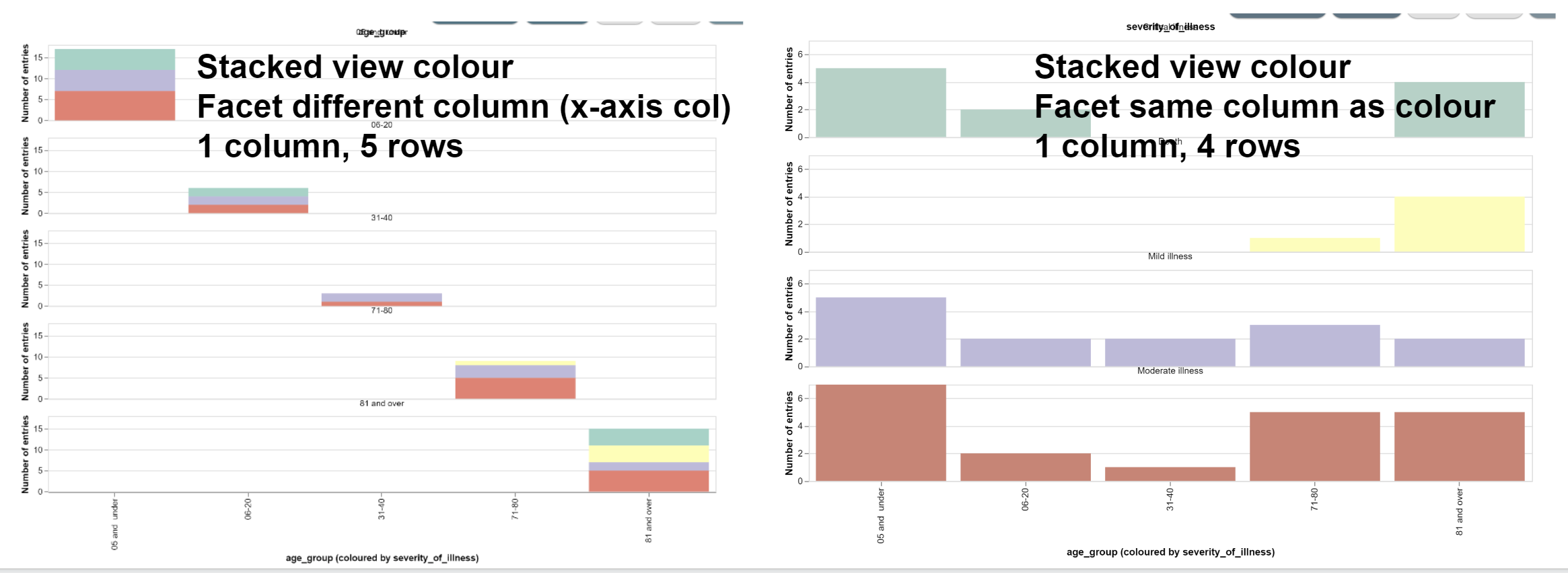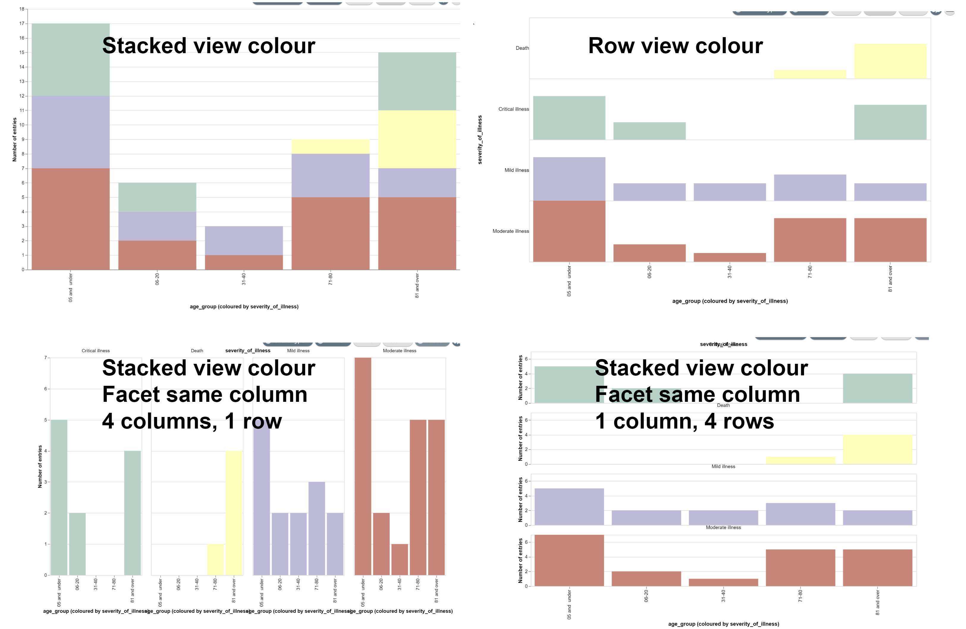 The Facet Column splits them into separate charts. Setting the number of columns and rows changes the display layout of the charts. Setting one row per facet makes a very similar chart to selecting the "Row view" colour options.