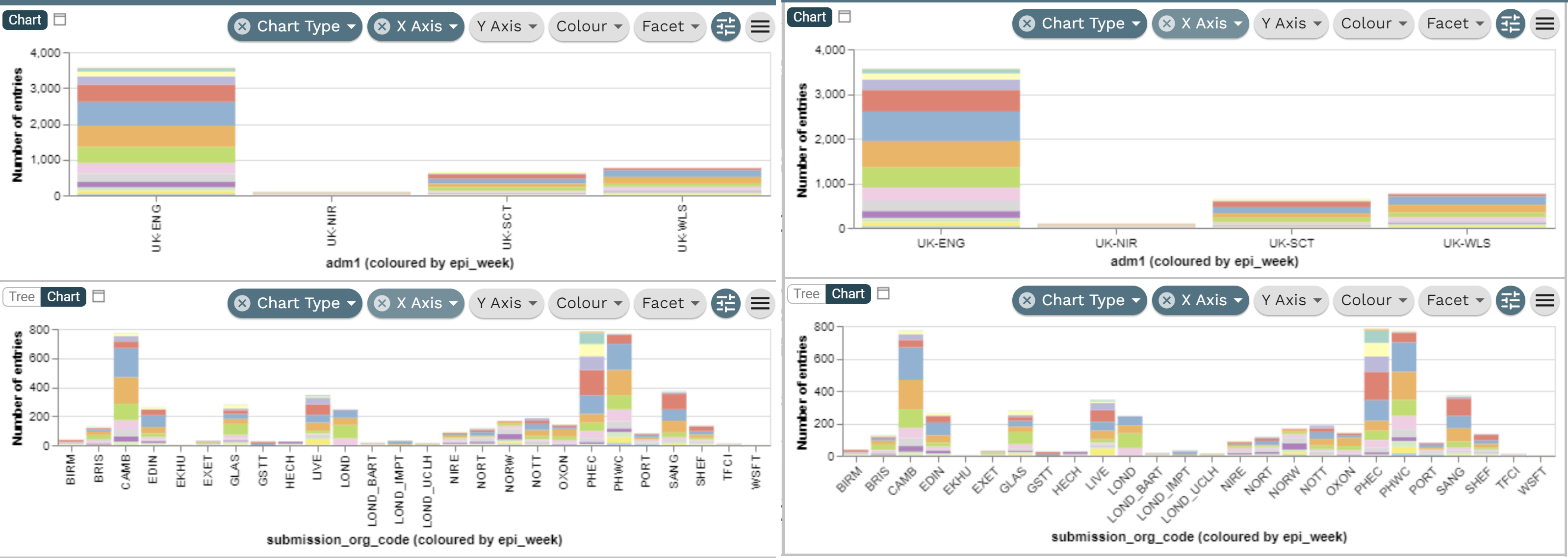 Most charts use [X-axis, Y-axis](#x-axis-and-y-axis), [Colour](#colour-column), and [Facet](#facet-column), and can accomodate formatted [labels](#label-angles-and-size).