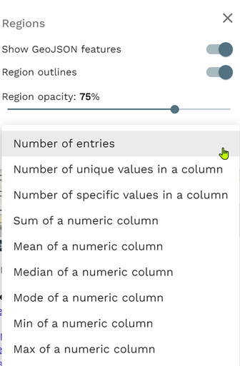 When GeoJSON regions are included in the data, the map menus will include a new lozenge called "**Regions**" with a few customisable options (including toggling the region features on/off). The calculation used for depth of colour can be changed, as well as which column is being aggregated.
