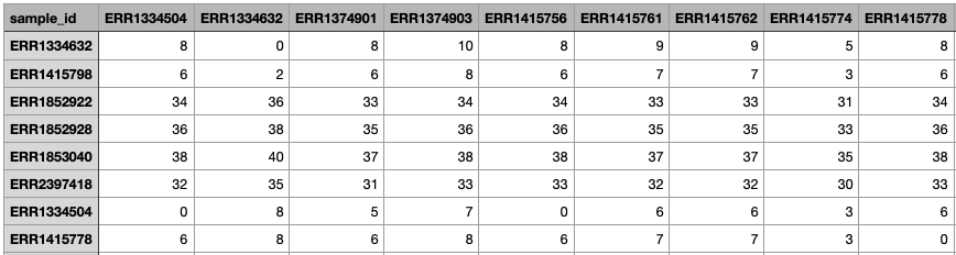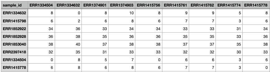Your matrix file will typically consist of both rows and columns of unique IDs. The intersecting values (table cells) could represent the relationship between each ID. Note that any unique IDs included in the matrix file must match the unique IDs in the metadata file in your Microreact project. An example is shown below with representing a matrix with the number of SNP differences between the sample IDs in the metadata.